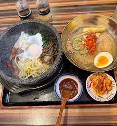 おはこんにちばんは! らら です🎀 まだ帰省中です、、、 色んなところにミャクミャクおって なんか一周回っておもろい うちの親がよく行く韓国料理屋さんに 連れてってもらいましたー! 私毎回帰省したら韓国料理食べに行ってんねんけどさ 別になんかルーツがあるとかじゃなくて ただただ家族全員 韓国料理が好きっていう、、、 なぞでしょ?笑 冷麺セット! ビビンバがめっちゃ美味しくて ちゃんとおこげもついとったー🎶 冷麺はねりんごが乗っとった! 🍎 ちょーおいしかった 幸 美味しいものが食べれるのって 本当に幸せだよね〜😽🌷